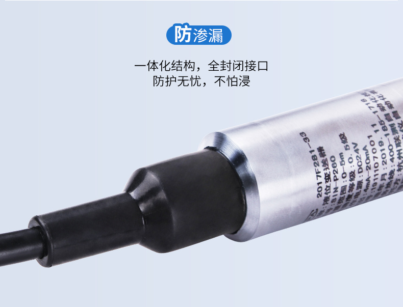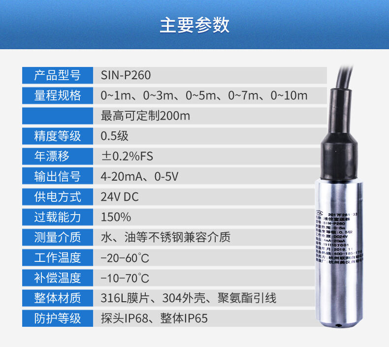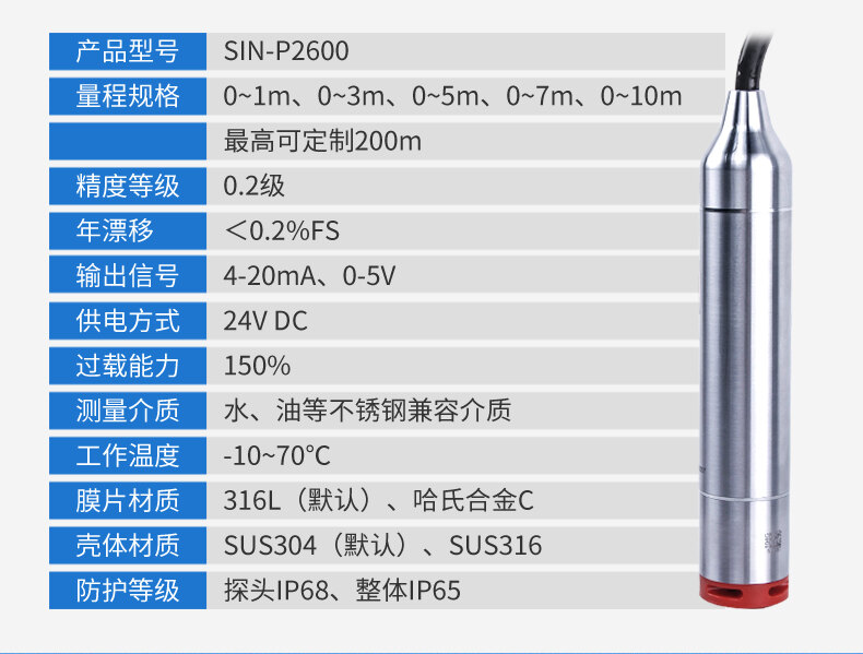 SIN-P260/P2600投入式液位變送器由高性能擴(kuò)散硅壓阻式壓力傳感器作為測量元件,把與液位深度成正比的液體靜壓力準(zhǔn)確測量出來,并經(jīng)過信號(hào)調(diào)理電路轉(zhuǎn)換成標(biāo)準(zhǔn)(電流或電壓)信號(hào)輸出,建立起輸出信號(hào)與液體深度的線性對(duì)應(yīng)關(guān)系,實(shí)現(xiàn)對(duì)液體深度的測量。